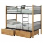 Σας παρουσιάζουμε τo κρεβάτι-κουκέτα RAYVEN σε συνδυασμό ξύλου- μετάλλου για μονά στρώματα 90x190εκ. Τα 4 πόδια-κολώνες του κρεβατιού είναι τα ξύλινα κομμάτια της σύνθεσης σε χρώμα ΟΞΙΑΣ, ενώ το κεφαλάρι, το ποδαρικό, τα πλαϊνά, η σκάλα, τα κάγκελα, και οι τάβλες στήριξης του στρώματος είναι όλα μεταλλικά σε ΜΑΥΡΟ χρώμα. Τα κεφαλάρια μάλιστα αποτελούνται από μεταλλική «σίτα», όπως και τα ποδαρικά. Η πρόσβαση στο επάνω κρεβάτι γίνεται με μια μεταλλική σκάλα που τοποθετείται βιδωτή στον σκελετό. Στο επάνω κρεβάτι υπάρχουν πλαϊνά προστατευτικά κάγκελα που προσφέρουν ασφάλεια από πτώσεις. Η πρακτικότητά του τονίζεται ακόμα περισσότερο χάρη στα δύο συρτάρια δαπέδου με ροδάκια, που τοποθετούνται κάτω από το κρεβάτι, και διαθέτουν όμορφη πρόσοψη μελαμίνης σε χρώμα παρόμοιο με τον σκελετό του κρεβατιού. Ιδανικό τόσο για το σπίτι, όσο και για επαγγελματικούς χώρους, όπως AirBnB, ξενοδοχεία κτλ.