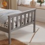 Το παιδικό κρεβάτι GIMLY σε διάσταση για στρώμα 90x190 εκ, είναι κατασκευασμένο από ξύλο πεύκου σε ΓΚΡΙ χρώμα, με ψηλά πόδια, ενώ το στρώμα τοποθετείται σε τάβλες από κόντρα-πλακέ ξυλεία.