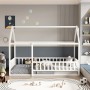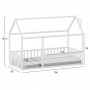Το παιδικό κρεβάτι HOUSER τύπου Montessori σε διάσταση για στρώμα 90x190εκ, είναι κατασκευασμένο από ξύλο πεύκου σε ΛΕΥΚΟ χρώμα. Όλο το κρεβάτι που πατάει στο πάτωμα έχει σχήμα σπιτιού με καμινάδα και περιμετρικά κάγκελα, ενώ το στρώμα τοποθετείται σε τάβλες από κόντρα-πλακέ ξυλεία.