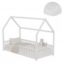 Το παιδικό κρεβάτι PHYLLIS τύπου Montessori σε διάσταση για στρώμα 90x190εκ, είναι κατασκευασμένο από ξύλο πεύκου σε ΛΕΥΚΟ χρώμα. Όλο το κρεβάτι έχει σχήμα σπιτιού με εξαιρετικά χαμηλά πόδια και περιμετρικά κάγκελα, ενώ το στρώμα τοποθετείται σε τάβλες από κόντρα-πλακέ ξυλεία.