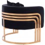 Η πολυθρόνα ΤΙΑΝΑ είναι μια πανέμορφη πολυθρόνα σε μαυρο χρώμα και μεταλλικό σκελετό σε χρυσό χρώμα. Ο σκελετός καταλήγει στα πόδια της πολυθρόνας που είναι σε ημικυκλική διάταξη βάσης με 3 κάθετα σταθερά πάνω στο μεταλλικό ημικύκλιο. Μια καρέκλα που δίνει κάτι το ξεχωριστό σε οποιοδήποτε επαγγελματικό χώρο. Ξεχωριστή, ποιοτική και κομψή σίγουρα θα τραβήξει τα βλέμματα. Η πλάτη είναι χαμηλή αλλά συνοδεύεται από ένα μαλακό μαξιλάρι, ενώ όλη η πολυθρόνα έχει βελούδινη επένδυση, πράγμα που επιτείνει τον ιδιαίτερο χαρακτήρα αυτής της πολυθρόνας.