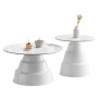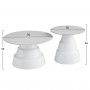 Αυτό το σετ τραπεζιών για το σαλόνι αποτελείται από 2 μεταλλικά τραπεζάκια στρογγυλά διαφορετικών μεγεθών. Οι βάσεις τους έχουν σχήμα διαβαθμισμένου κώνου σε ΛΕΥΚΟ glossy χρώμα, ενώ οι επιφάνειες είναι κατασκευασμένες από γυαλιστερό sintered stone σε χρωματικό σχήμα SNOW WHITE. Ιδανικά τόσο για το σπίτι, όσο και για επαγγελματικούς χώρους.