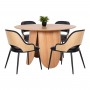 Αυτό το σετ τραπεζαρίας εσωτερικού χώρου αποτελείται από ένα τραπέζι DENTY και 4 καρέκλες DELF. Το DENTY είναι ένα στρογγυλό τραπέζι για την τραπεζαρία, με φαλτσοκομμένη επιφάνεια από MDF με καπλαμά δρυός σε ΦΥΣΙΚΟ χρώμα ΔΡΥΟΣ. Η επιφάνεια αυτή στηρίζεται σε μία πανέμορφη ξύλινη κυλινδρική βάση με ίδιο χρωματισμό. Οι καρέκλες DELF έχουν επένδυση με PU σε ΜΑΥΡΗ απόχρωση και ΜΑΥΡΑ μεταλλικά πόδια. Αυτό, όμως, που ξεχωρίζει είναι ότι ολόκληρη η πλάτη είναι ξύλινη σε χρώμα ΔΡΥΟΣ (OAK) κι είναι κυρτή και αναπαυτική.
