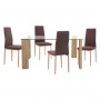 Ένα ορθογώνιο τραπέζι με πόδια από MDF σε SONAMA χρώμα και γυάλινη επιφάνεια, και 4 καρέκλες με μεταλλικά πόδια και επένδυση από ύφασμα σε ΚΑΦΕ χρώμα.