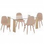 Ένα ορθογώνιο τραπέζι με πόδια από MDF σε SONAMA χρώμα και γυάλινη επιφάνεια, και 4 καρέκλες με πόδια μεταλλικά σε καφετί χρώμα και κάθισμα με επένδυση από ΜΠΕΖ ύφασμα.