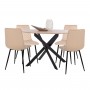 Ένα στρογγυλό τραπέζι με ΜΑΥΡΑ μεταλλικά πόδια με όμορφο στυλ και φαλτσοκομμένη MDF επιφάνεια σε χρώμα SONAMA, και 4 καρέκλες επενδυμένες με εντυπωσιακό ΕΚΡΟΥ βελούδο και μεταλλικά πόδια σε ΜΑΥΡΟ χρώμα.
