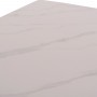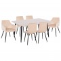 Ένα ορθογώνιο τραπέζι με σκελετό μεταλλικό σε ΜΑΥΡΟ χρώμα και κεραμική επιφάνεια με όψη ΛΕΥΚΟΥ ΜΑΡΜΑΡΟΥ, και 4 καρέκλες ΚΑΙ 2 πολυθρόνες με πλάτη και κάθισμα με επένδυση από βελούδινο ύφασμα σε ΕΚΡΟΥ χρώμα και μεταλλικά πόδια σε ΜΑΥΡΟ χρώμα.