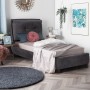 Το μονό κρεβάτι RILEY είναι επενδυμένο με βελούδο σε ΓΚΡΙ χρώμα. Το στρώμα (διατίθεται σε ROLL-PACKING*) που συνοδεύει το κρεβάτι τοποθετείται σε δύο σειρές ανατομικές τάβλες, είναι διπλής όψης και είναι ΑΦΡΟΥ χωρίς ελατήρια. Τα πόδια είναι σχετικά ψηλά από πολυπροπυλένιο σε μαύρο χρώμα.
