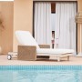 Σας παρουσιάζουμε μια πολυτελή ξαπλώστρα αλουμινίου της σειράς DESTINY. Μια σειρά που, μαζί με άλλες, ανεβάζει τον πήχη της ποιότητας και της αισθητικής που προσφέρουμε σε εσάς, τόσο για το σπίτι, όσο και για κάθε ανάλογο επαγγελματικό χώρο! Με απαράμιλλη ποιότητα κατασκευής και υλικών, θα αναβαθμίσει την εικόνα σε όποιο χώρο επιθυμείτε. Ο σκελετός αυτής της ξαπλώστρας είναι σε χρώμα ΕΚΡΟΥ, ενώ τα μπράτσα της είναι επενδυμένα με rattan σε πλέξη wicker. Η ανάκλιση πραγματοποιείται με κλασική «σκαλιέρα» 4 θέσεων συν μία που είναι η οριζόντια. Το επάνω μέρος του στρώματος διαθέτει κορδόνια που δένονται με «χρατς» ενώ το κυρίως στρώμα «κολλάει» στην ξαπλώστρα επίσης με «χρατς», τα οποία βρίσκονται στο πανί textilene που λειτουργεί και ως βάση για το στρώμα. Τέλος, η ξαπλώστρα διαθέτει και 2 ρόδες για εύκολη μετακίνηση!