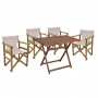 Το σετ περιλαμβάνει: * Ένα (1) τραπέζι κήπου Retto από μασίφ ξύλο φουρνιστής οξιάς σε χρώμα καρυδί διάστασης: 80x60x72εκ. * Τέσσερα (4) πολυθρόνες κήπου Retto από μασίφ ξύλο φουρνιστής οξιάς σε χρώμα καρυδί διάστασης: 61x51x86 εκ. * Τέσσερα (4) πανιά διάτρητα πυκνότητας 2x1 χρώματος μπεζ-γκρι.